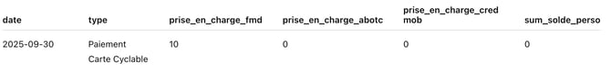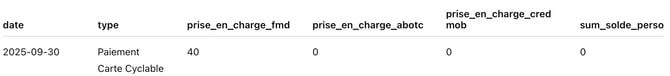 Exemple : Un bénéficiaire effectue un achat de 40 € chez Cyclable en boutique, le mercredi 3 septembre 2025 (date d’initiation du paiement indiquée dans le rapport de prise en charge).