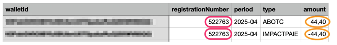 - Dans le cas où la reprise sur carte n'est pas possible, la plateforme va donc envoyer dans le fichier paie du 02/05 (reprenant les opérations d'avril) une ligne IMPACTPAIE afin de transmettre l'information à votre service paie qu'il faille reprendre le bénéficiaire directement sur son salaire.